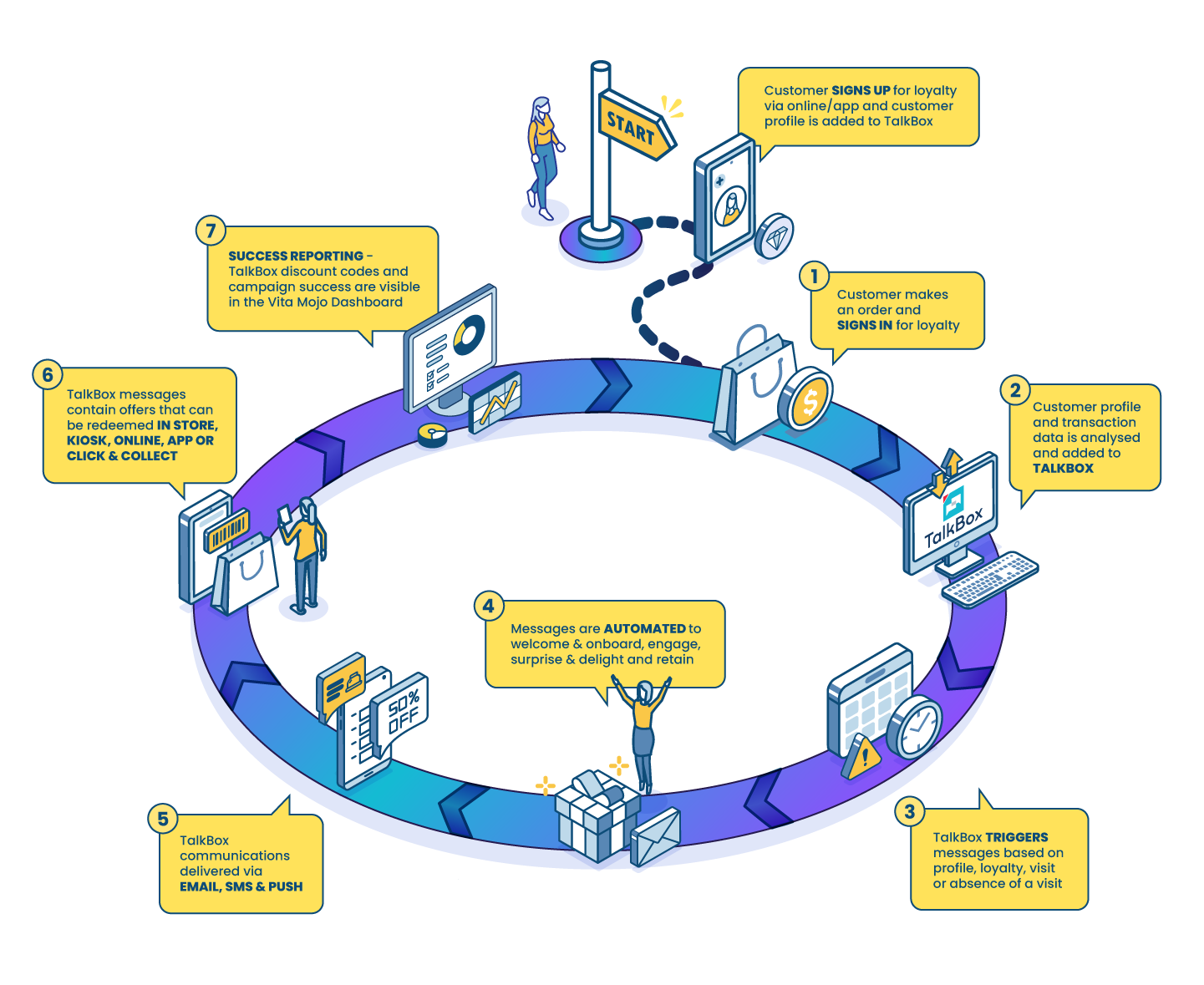 - TalkBox allows you to automate clever, timely communications to increase visitation and spend, as well as send brand and promotional messages